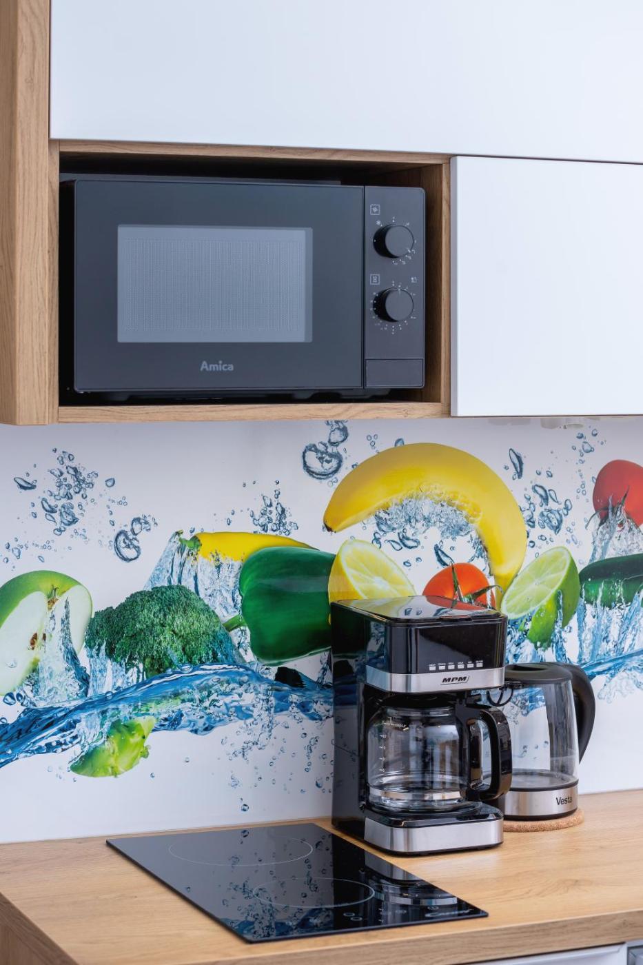 Rodzinny apartament typu Studio. The studio has a private bathroom, a washing machine, a private entrance, as well as a seating area with a flat-screen TV. The well-equipped kitchenette features a stovetop, a refrigerator, kitchenware and a microwave. The studio offers a tea and coffee maker, a dining area, a wardrobe, a sofa and a TV. The unit has 2 beds. Studio - 5 osobowy. Powierzchnia pokoju ok.: 22 mkw.
