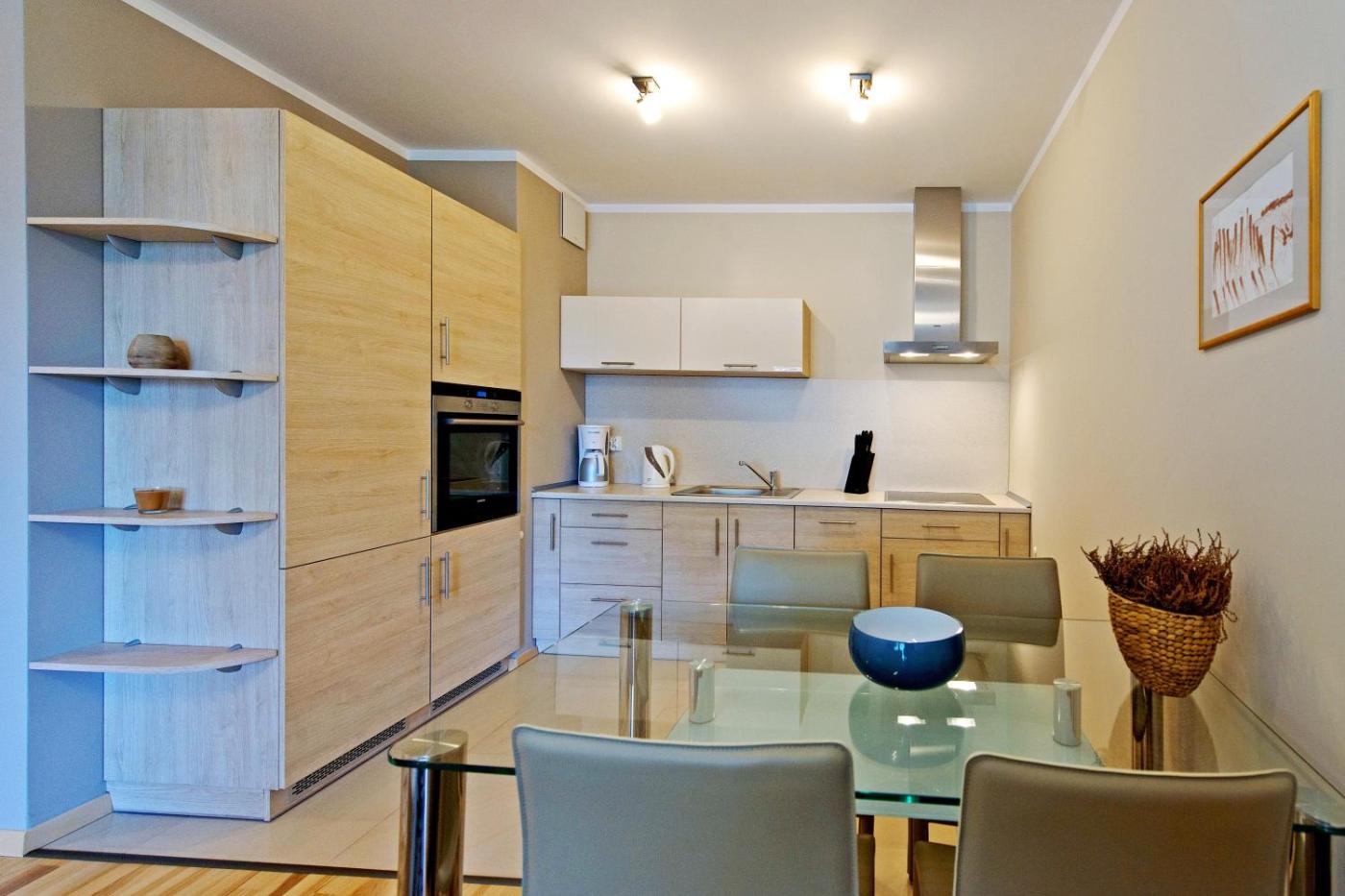 Goście mogą przygotowywać posiłki we w pełni wyposażonym, nowoczesnym aneksie kuchennym z kuchenką mikrofalową, piekarnikiem oraz szklanym stołem i krzesłami. W każdym z nich znajduje się także czajnik elektryczny.